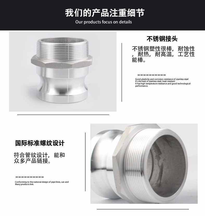 光伏半導(dǎo)體槽車快裝接頭也叫扳把式光伏半導(dǎo)體槽車快裝接頭,它是一種不需要工具就能實(shí)現(xiàn)管路連通或斷開(kāi)的光伏半導(dǎo)體槽車快裝接頭,使用陰陽(yáng)配套應(yīng)用偏心原理實(shí)現(xiàn)制動(dòng)扳把式凸輪鎖緊,方便快速連接拆卸,中間使用丁腈橡膠墊密封,如需耐腐蝕或者介質(zhì)為強(qiáng)酸強(qiáng)堿可更換氟橡膠密封墊,可配套PP法蘭,常用于涂裝、噴涂、化工、噸桶等設(shè)備的傳輸裝卸,螺紋有英制錐度螺紋(BSPT)和美制螺紋(NPT)。
