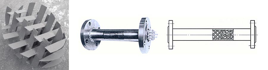 SH單元由雙孔道組成,孔道內(nèi)放置螺旋片,相鄰單元雙了L道的方位錯位90度,單元之間設(shè)有流體分配室,它的技術(shù)性能:最高分散程度=1—2um,液—液、液—固相的不均勻度α√ x≤1-5%。