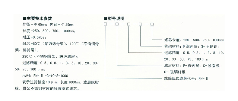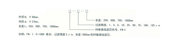 FN—III-5-1000-B表示:過(guò)濾精度為5 u m,長(zhǎng)度1000mm,端蓋為B型的聚丙烯折疊式濾芯。