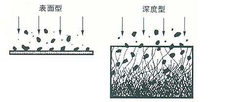 一深度過(guò)濾:將顆粒捕捉于濾材深層中,而不只是表面的過(guò)濾。此種濾材多由纖維構(gòu)成,如纖維燒結(jié)濾材、樹脂燒結(jié)濾材。